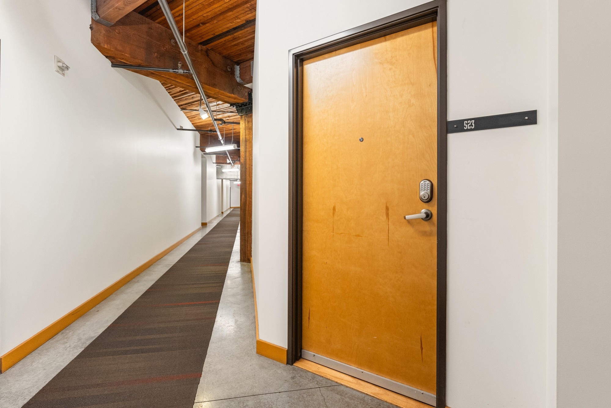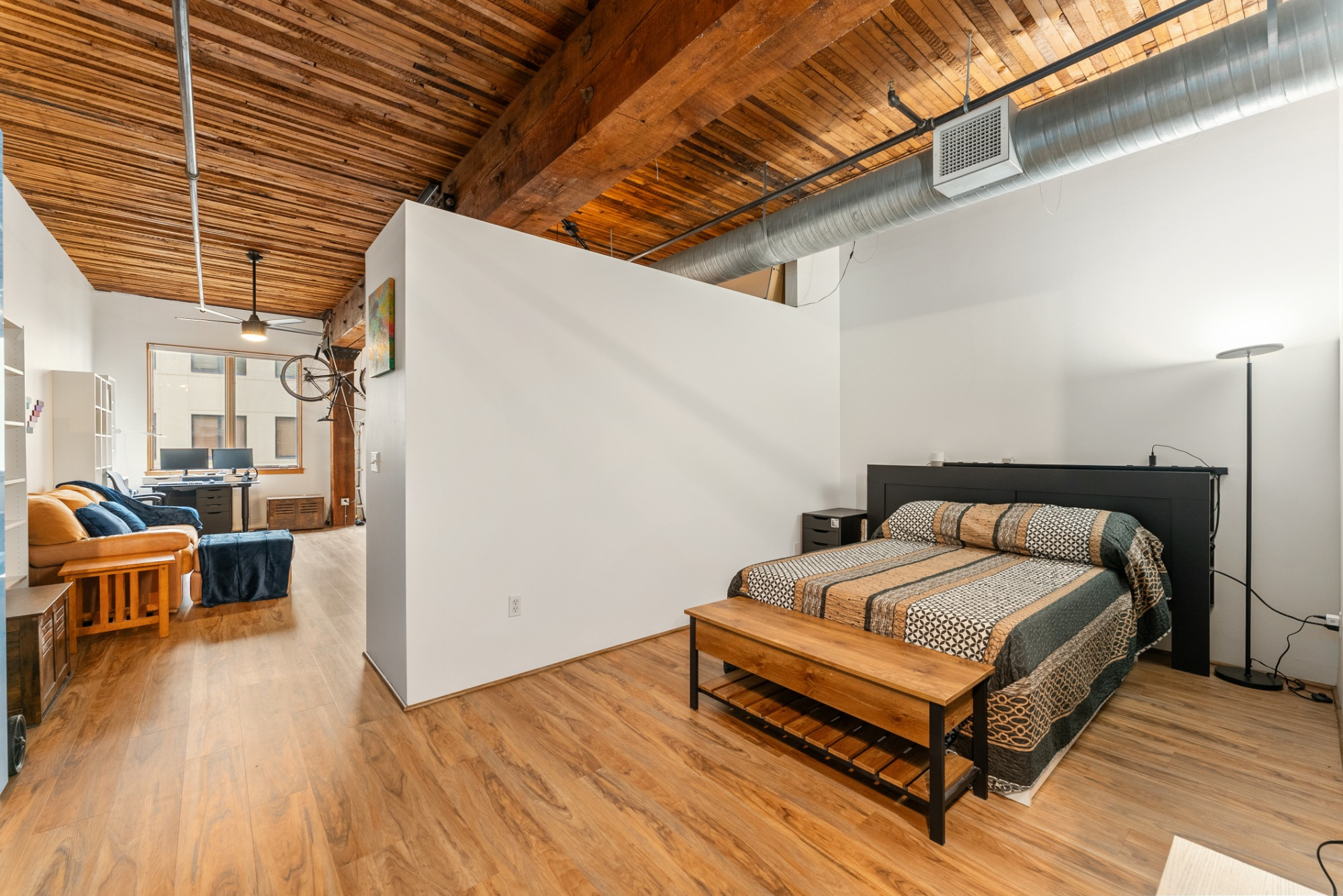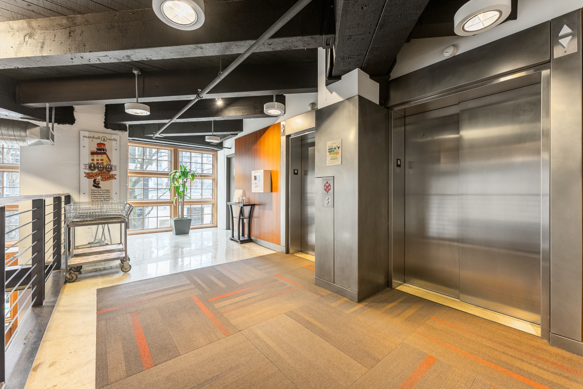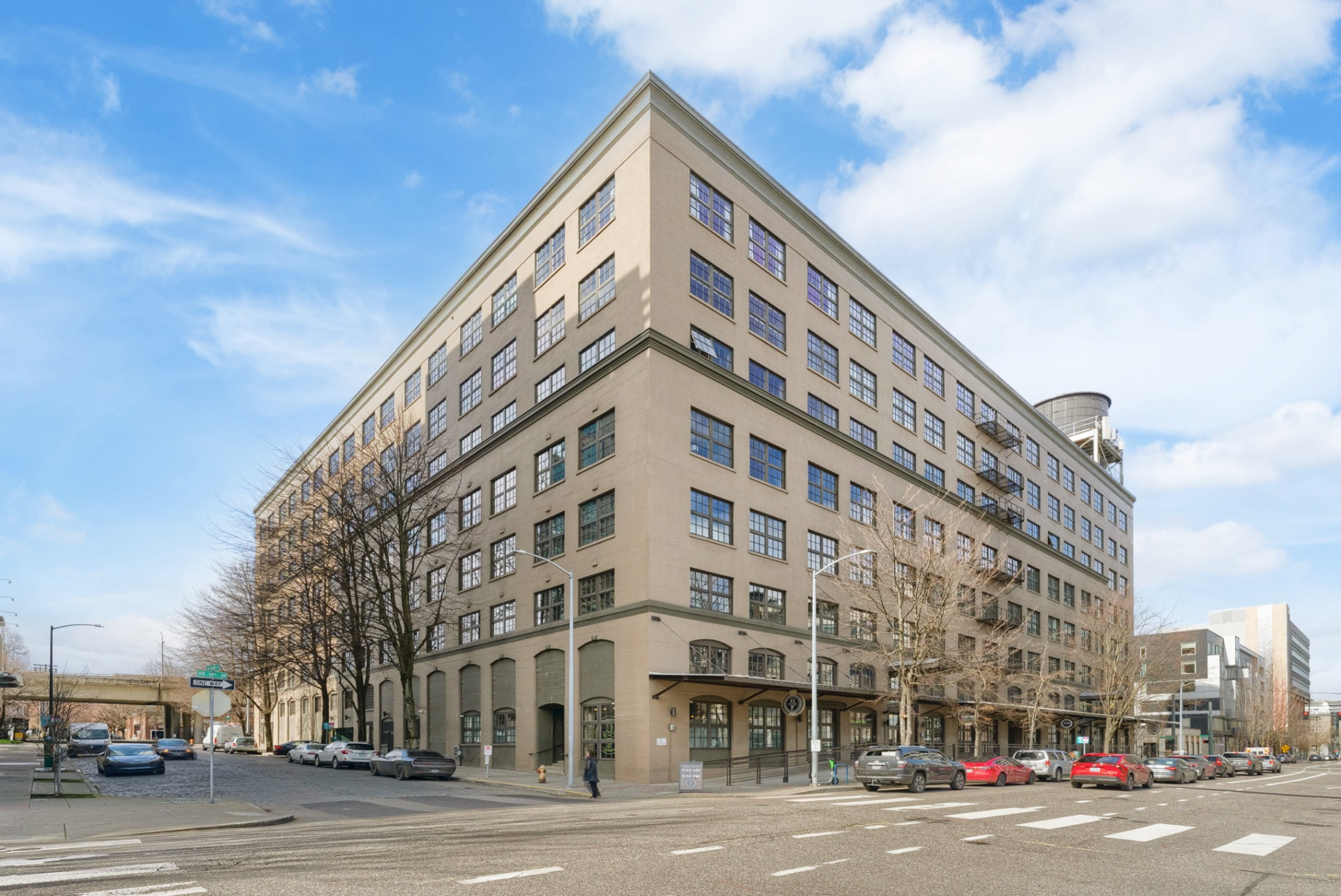 Live the true Pearl District loft lifestyle at Marshall Wells. This striking 5th-floor loft pairs timeless warehouse character with everyday functionality—soaring ceilings, exposed timber beams, rich wood ceiling detail, oversized windows, and signature industrial design elements create a warm, dramatic living space. The open floor plan offers room to relax, entertain, and work from home, while the kitchen features stainless steel appliances, tile finishes, and excellent storage. Includes deeded tandem parking, elevator access, and secure gated entry. HOA covers water, sewer, trash, exterior maintenance, commons, insurance, and gated access. Tandem 2 car parking space - you can build a storage unit on the parking space if you choose. Spaces 174 and 149. All just moments from Portland Streetcar, MAX, neighborhood parks, restaurants, and the best of the Pearl.