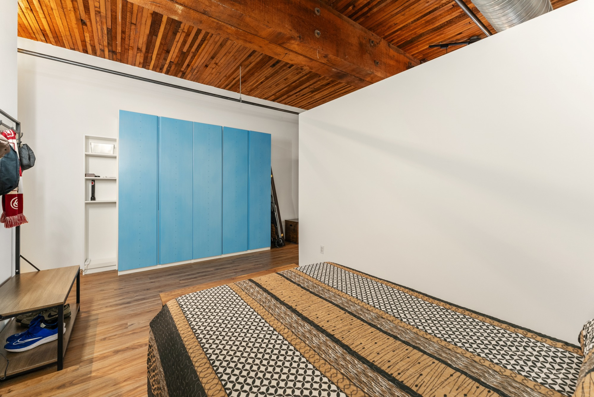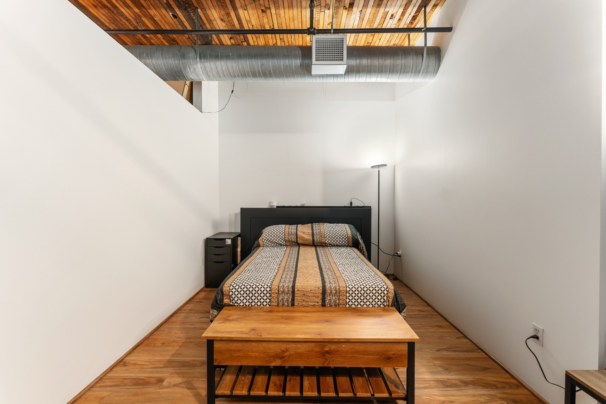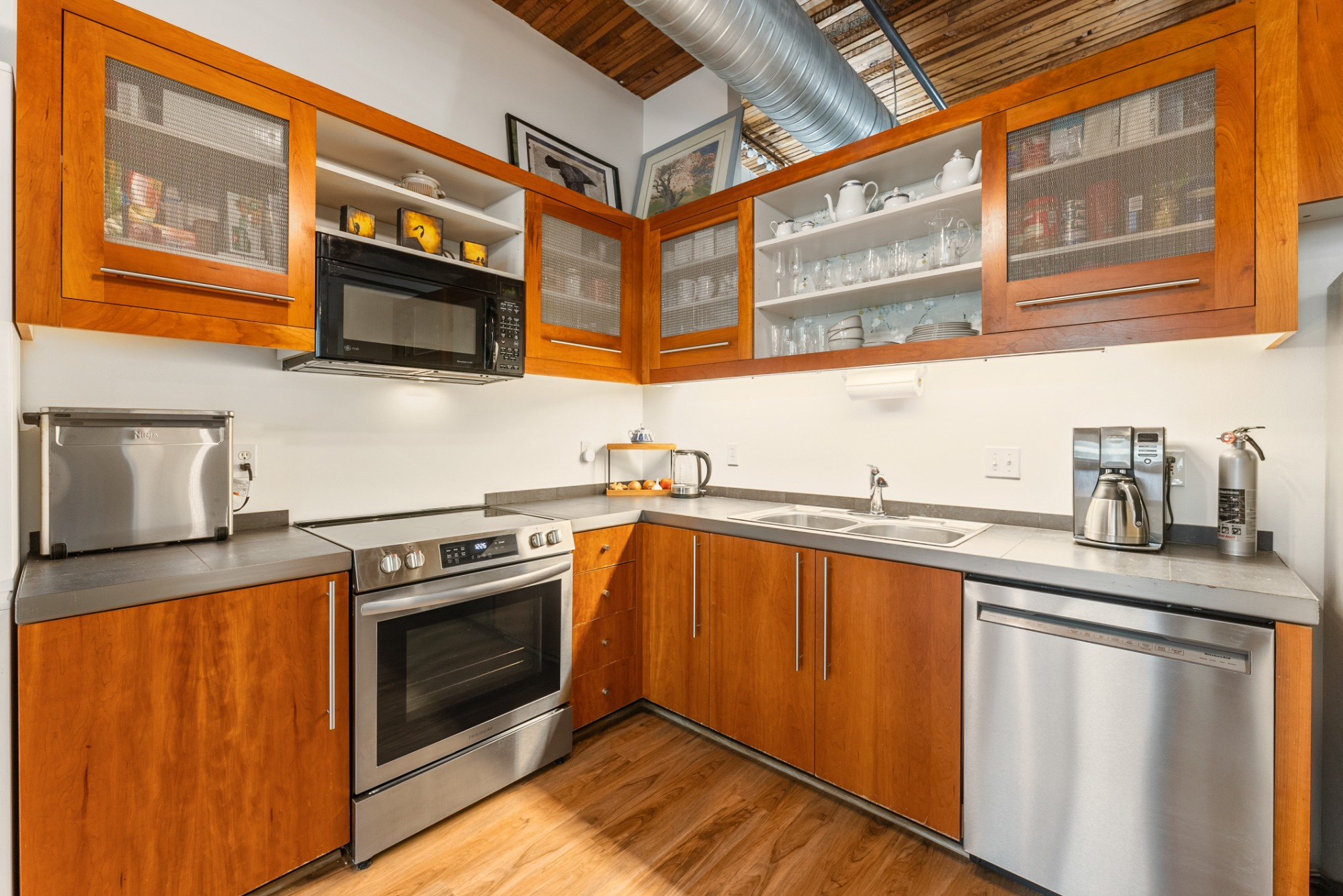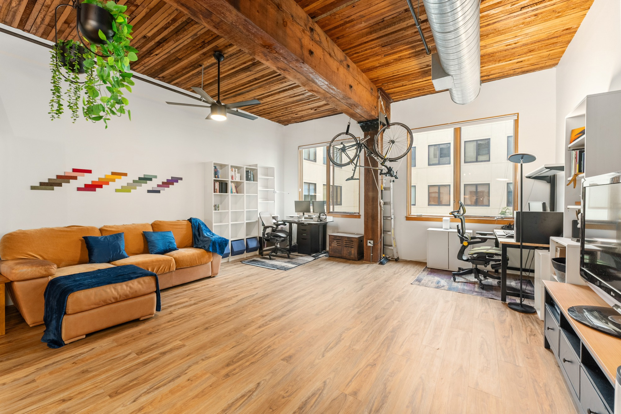 Live the true Pearl District loft lifestyle at Marshall Wells. This striking 5th-floor loft pairs timeless warehouse character with everyday functionality—soaring ceilings, exposed timber beams, rich wood ceiling detail, oversized windows, and signature industrial design elements create a warm, dramatic living space. The open floor plan offers room to relax, entertain, and work from home, while the kitchen features stainless steel appliances, tile finishes, and excellent storage. Includes deeded tandem parking, elevator access, and secure gated entry. HOA covers water, sewer, trash, exterior maintenance, commons, insurance, and gated access. Tandem 2 car parking space - you can build a storage unit on the parking space if you choose. Spaces 174 and 149. All just moments from Portland Streetcar, MAX, neighborhood parks, restaurants, and the best of the Pearl.